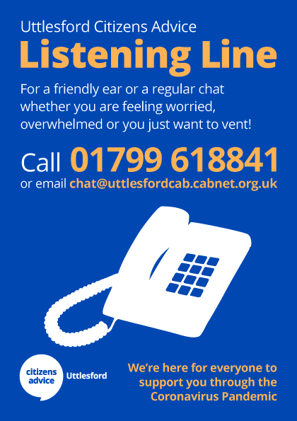 Uttlesford Citizens Advice has produced a leaflet giving details of the range of services on offer which may help people during this difficult time. This includes a new ‘Listening Line’ service, which aims to provide a friendly ear for anyone who is feeling overwhelmed or who may like a regular call to combat loneliness.