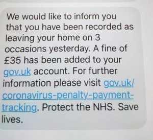 If you are fined for breaking Coronavirus restrictions on movement then you will know about it because a Police Officer will directly charge you, face to face. There will be no emails or text messages.