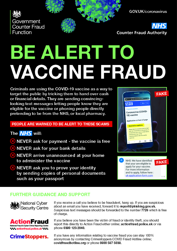 As we are constantly reminded, beware of fraudsters. The NHS will NEVER ask you to pay for a vaccine or to hand over bank account details.